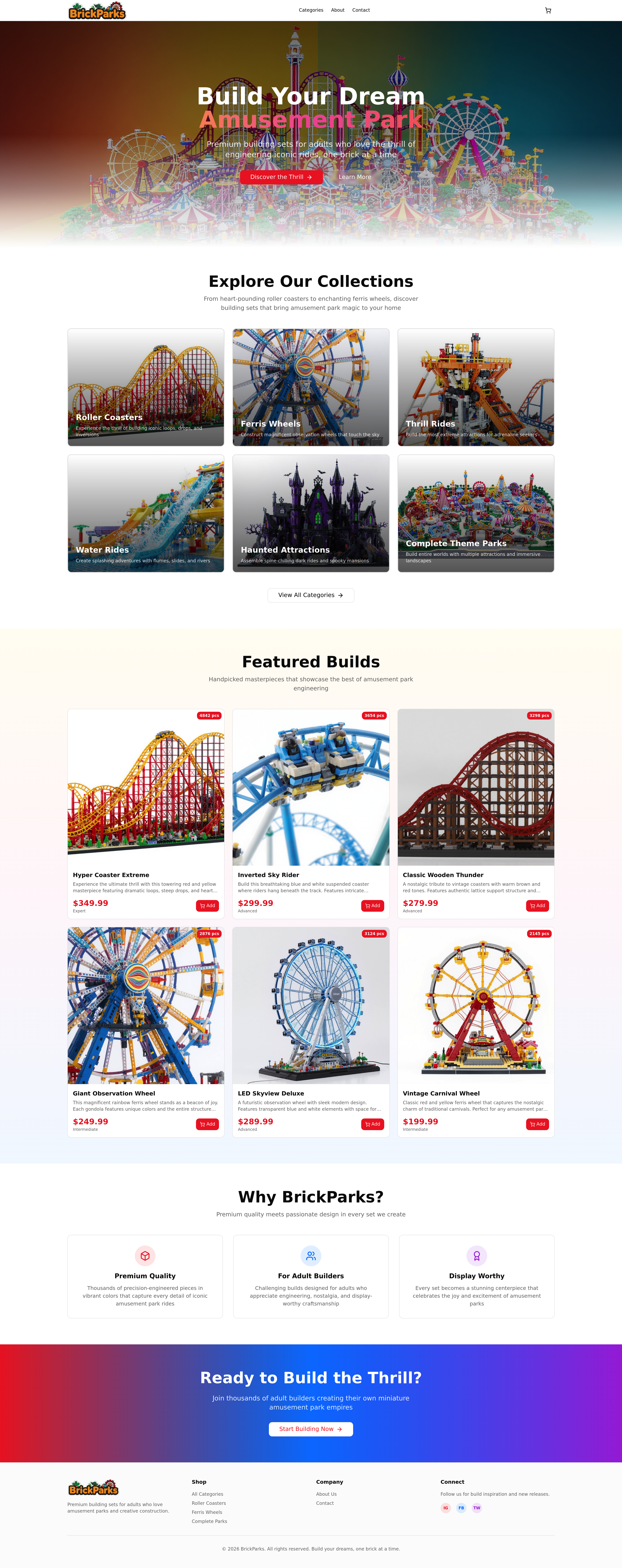Explore a vibrant online store showcasing premium, LEGO-style adult building sets inspired by iconic amusement park attractions. Discover intricate models of roller coasters, Ferris wheels, and complete theme parks, designed for adult enthusiasts. This colorful and playful e-commerce platform offers a visually stunning experience with detailed product showcases and a user-friendly interface, perfect for those seeking creative and nostalgic building challenges.