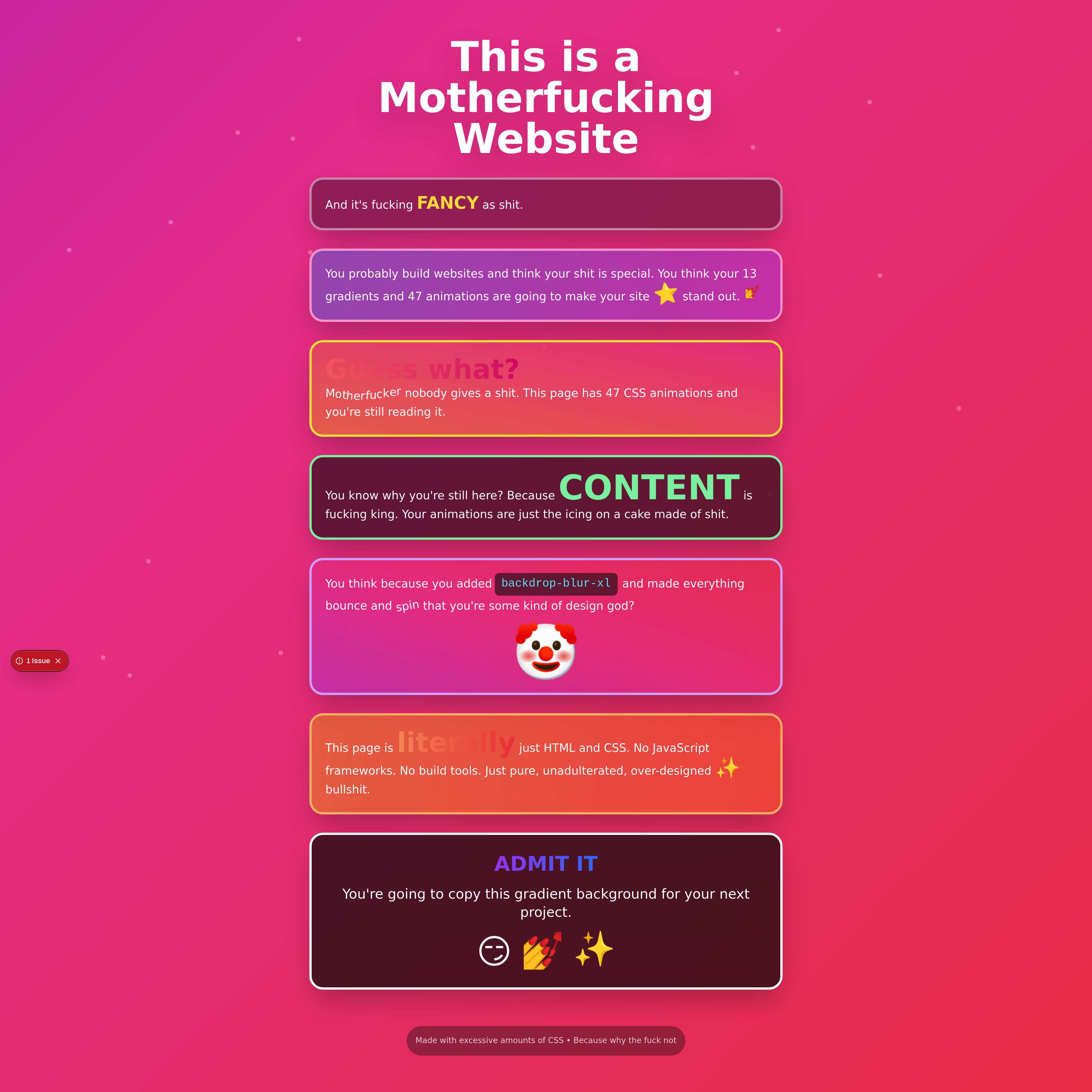 Explore a humorous and visually rich parody website, inspired by the minimalist aesthetic of "motherfuckingwebsite.com" but overloaded with intricate CSS and engaging animations. This project showcases advanced front-end development skills and creative design, perfect for web developers and designers looking for inspiration in playful web experiences.