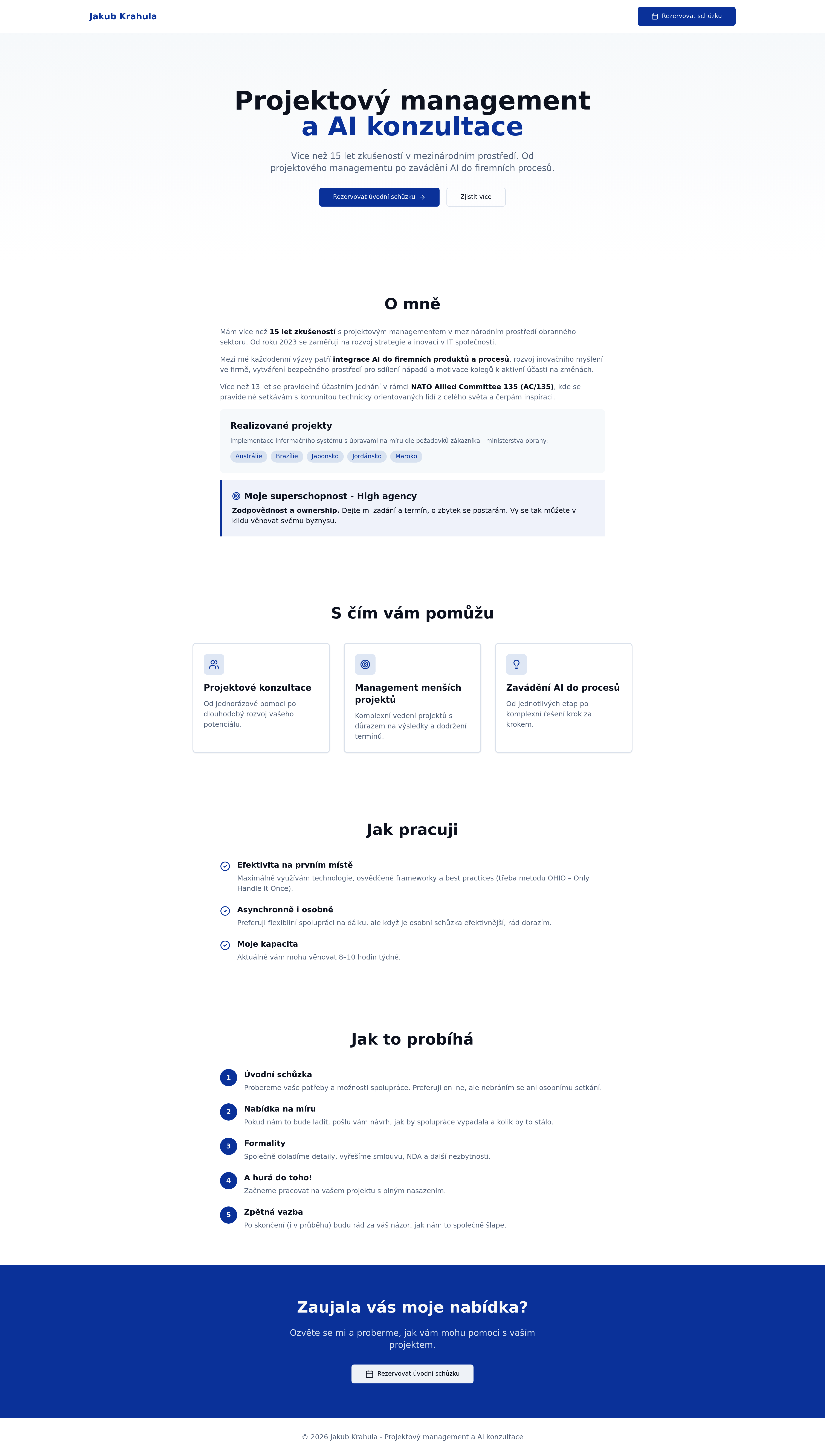 Showcase your project management and AI integration consulting services with this professional business website. Featuring an integrated online booking system for seamless client appointments, this site highlights expertise in strategic development, innovation, and AI implementation for businesses. Perfect for consultants, project managers, and strategists looking to attract new clients and streamline their scheduling.