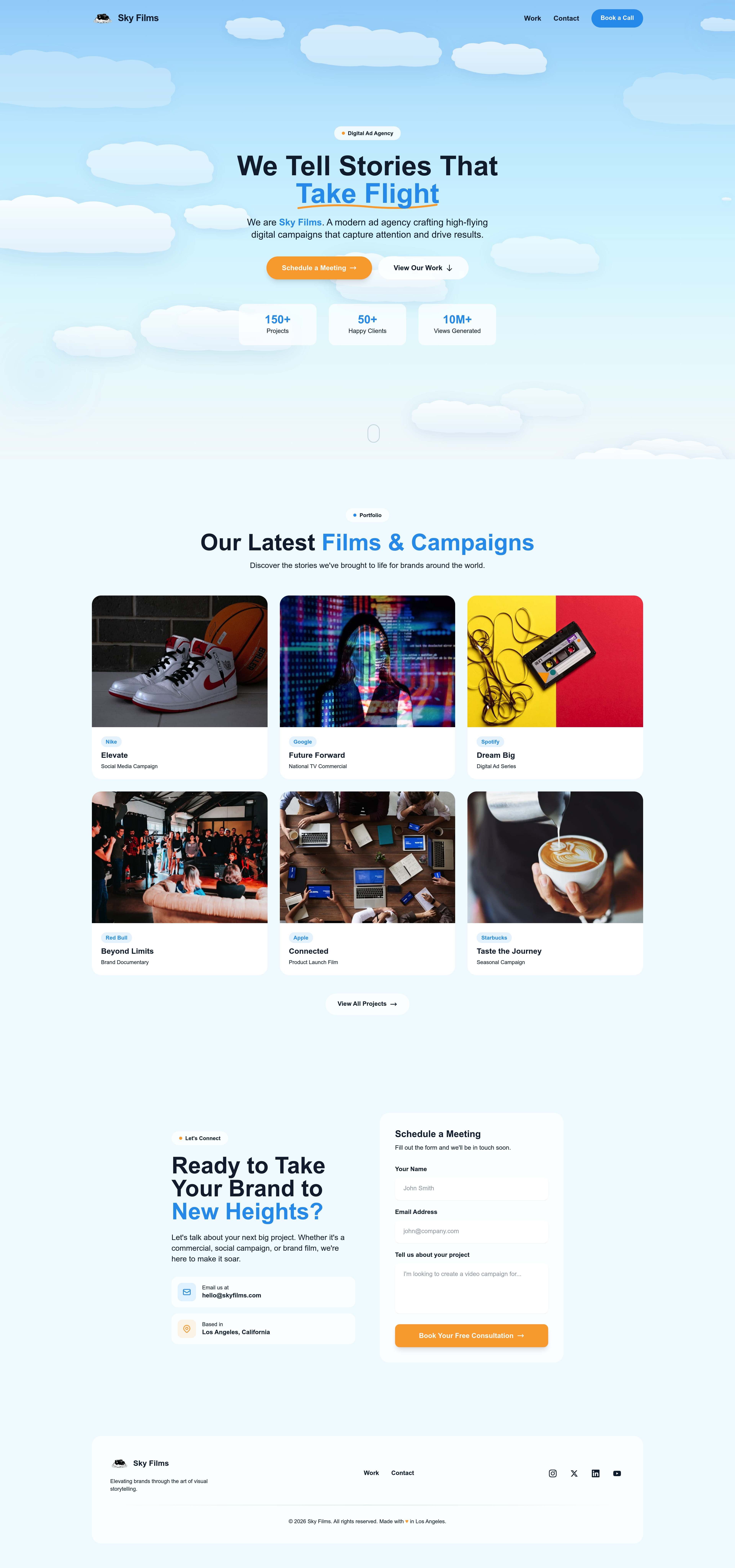 An immersive, sky-themed landing page for "Sky Films," a digital ad agency. This modern business website features a captivating parallax scrolling cloud background, a prominent call to action for scheduling meetings, and a sleek portfolio showcase. Designed to generate leads and highlight creative digital campaigns, it offers a professional and visually stunning user experience.